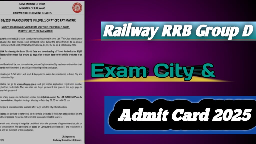Railway RRB Group D Exam City Admit Card 2025: रेलवे भर्ती बोर्ड (RRB) ने आरआरबी 2025 की परीक्षा के लिए एडमिट कार्ड ऑफीशियली वेबसाइट पर जारी कर दिया है। यह परीक्षा 27 नवंबर 2025 से 16 जनवरी 2026 तक की जाएगी। इस का आवेदन पत्र जमा करने का अंतिम तिथि 1 मार्च 2025 थी। उम्मीदवार इसके ऑफिशल पोर्टल पर जाकर लॉगिन करे। लॉगिन करने बाद नामांकन नंबर, पंजीकरण नंबर और अपना Date of barth का उपयोग करके अपना परीक्षा शहर और एडमिट कार्ड से संबंधित सभी जानकारी खुद से देख सकते हैं। मैं इसका ऑफिशियल लिंक सीधे नीचे दे रहा हूं।